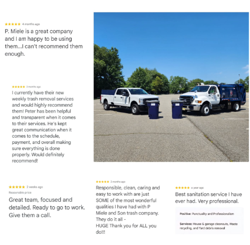 P. Miele And Son Contracting Services is a reputable provider of reliable private weekly trash pickup services for both residential and commercial clients in Teaneck and the surrounding areas. Established in 1926 by my great-grandfather, we are dedicated to promoting clean communities through dependable and efficient waste management solutions tailored to the specific needs of each client. Our team takes pride in delivering consistent, reliable, and customer-focused service, including personalized private and White Glove options. We emphasize not only collection but also comprehensive waste management and sanitization, all while upholding competitive pricing and a strong commitment to environmentally responsible practices.